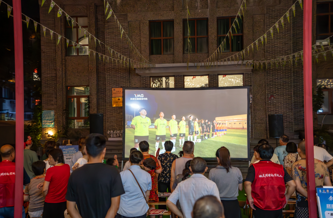 与此同时,瓶窑老街第二观赛空间内灯火如昼、人声鼎沸,老街电影院门前的露天银幕上实时转播这场赛事。前来观看的球迷们或坐或立,目光紧随绿茵场上的每一次传球与冲刺。